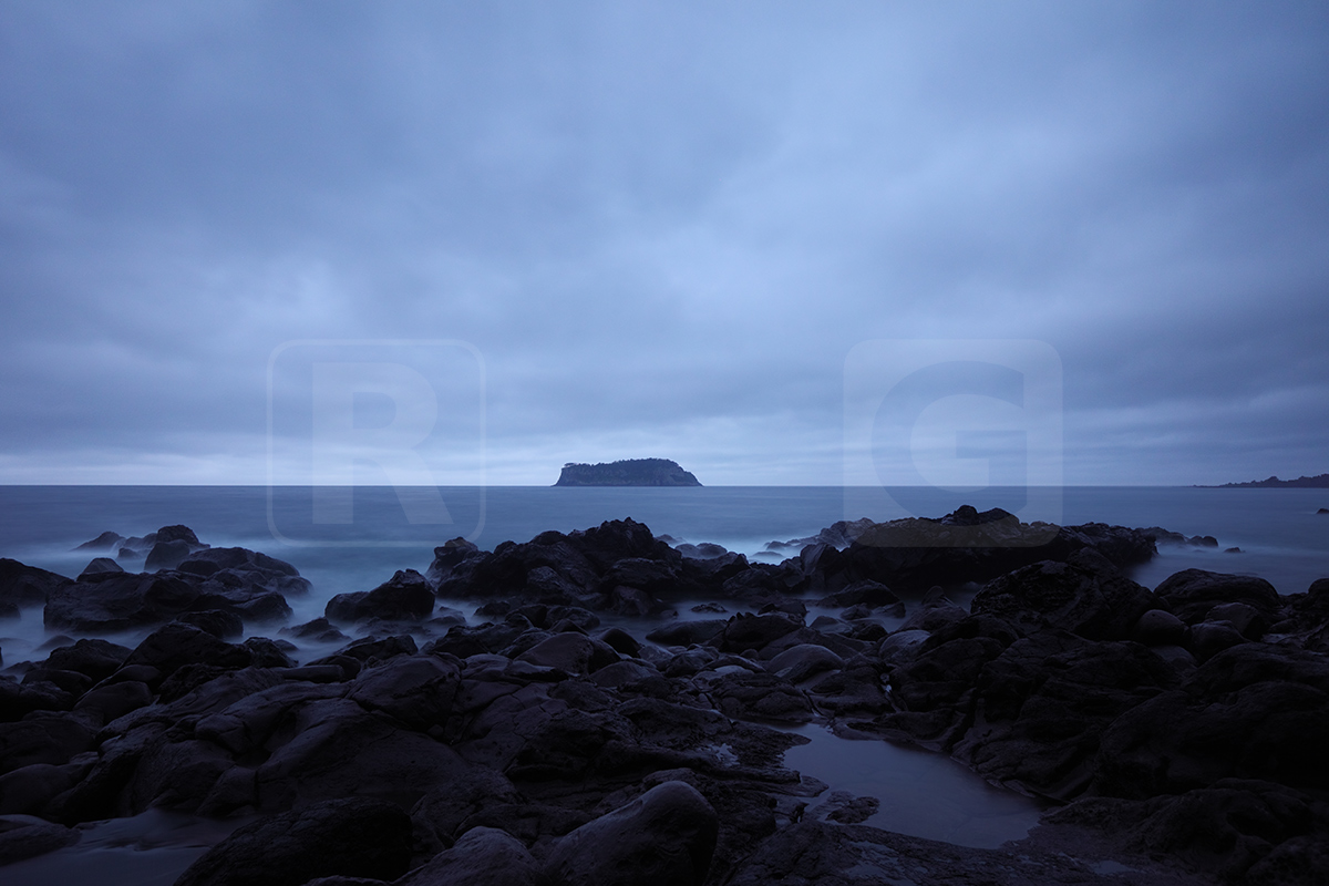 H010900, Photograph(사진), Jejudo(Jeju Island, 제주도), Asia(아시아), Korea(한국), Background(배경), Landscape(풍경), Nature(자연), Sea(바다), Beach(해변), Rock(암석), Stone(돌), Landscape(풍경), Fantastic(환상적), Skyline(지평선), Summer(여름), Cloud(구름), Cloudy(흐림), Wide(전경), 저속촬영, Blue(Cyan)